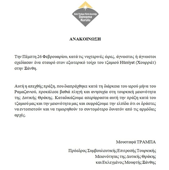 Το Συμβουλευτικό Όργανο της Τουρκικής Μειονότητας της Δυτικής Θράκης εξέδωσε γραπτή ανακοίνωση, καταδικάζοντας απερίφραστα την επίθεση στο τζαμί Χουρριέτ στην Ξάνθη. Στην ανακοίνωση υπογραμμίζεται ότι η αναγραφή ενός σταυρού στον εξωτερικό τοίχο του τζαμιού κατά τη διάρκεια του ιερού μήνα του Ραμαζανιού αποτελεί μια ‘απεχθή πράξη’ που προκαλεί βαθιά ανησυχία στη μειονότητα.”