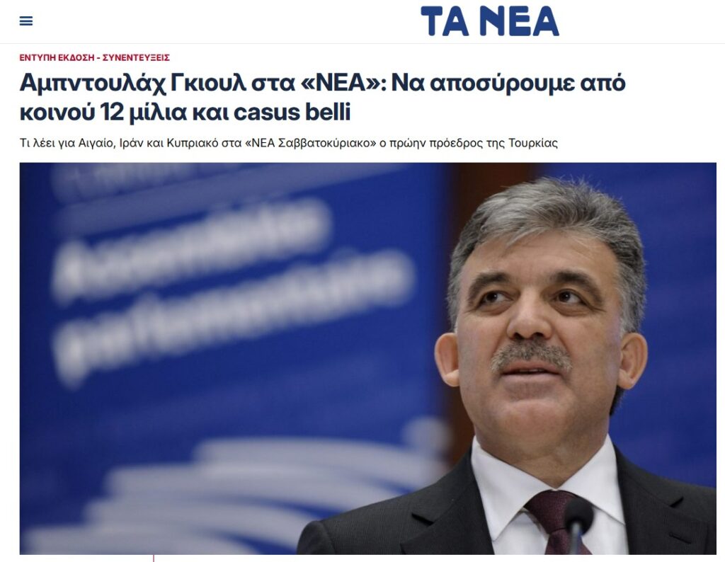 Türkiye eski Cumhurbaşkanlarından Abdullah Gül, NEA gazetesinin Cumartesi-Pazar eki (NEA Savvatokiriako) gazetesine verdiği mülakatta, Yunanistan’ın karasularını 12 mile çıkarma iddiasından vazgeçmesi durumunda, Türkiye’nin “casus belli” (savaş sebebi) deklarasyonunun otomatik olarak gerekliliğini ve işlevini yitireceğini savundu.