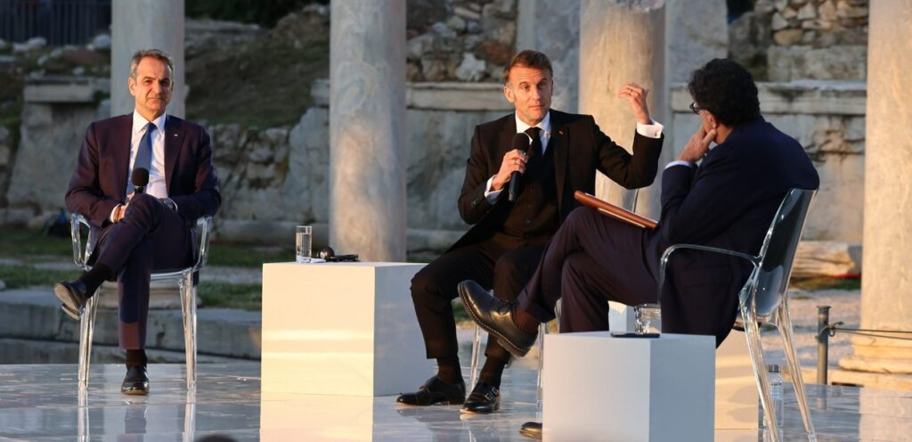 Macron’un Atina programı Cuma günü tarihi Roma Çarşısı’nda Miçotakis ile gerçekleştirdiği özel buluşmayla başladı. İki lider burada Avrupa’nın geleceği, stratejik özerklik, savunma sanayii ve küresel jeopolitik gelişmeler üzerine kapsamlı bir değerlendirme yaptı.