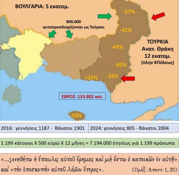 Evros (Meriç), yaşadığımız demografik çöküşün durdurulması cenneti olabilir ve ülkemizin geri kalanı için de bir model teşkil edebilir. Ancak bu, bugün yapılmalı, yarın değil. Yarın geç olacak. Tren geç gelirse, geldiğinde alacak yolcu bulamayacak. Gecikirsek, Kutsal Kitap’ın dediği şey olacaktır: “Konutu ıssız kalsın, içinde oturan bulunmasın ve onun gözetmenliğini bir başkası alsın” (Elç.İşl. 1:20).”