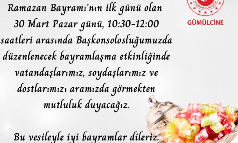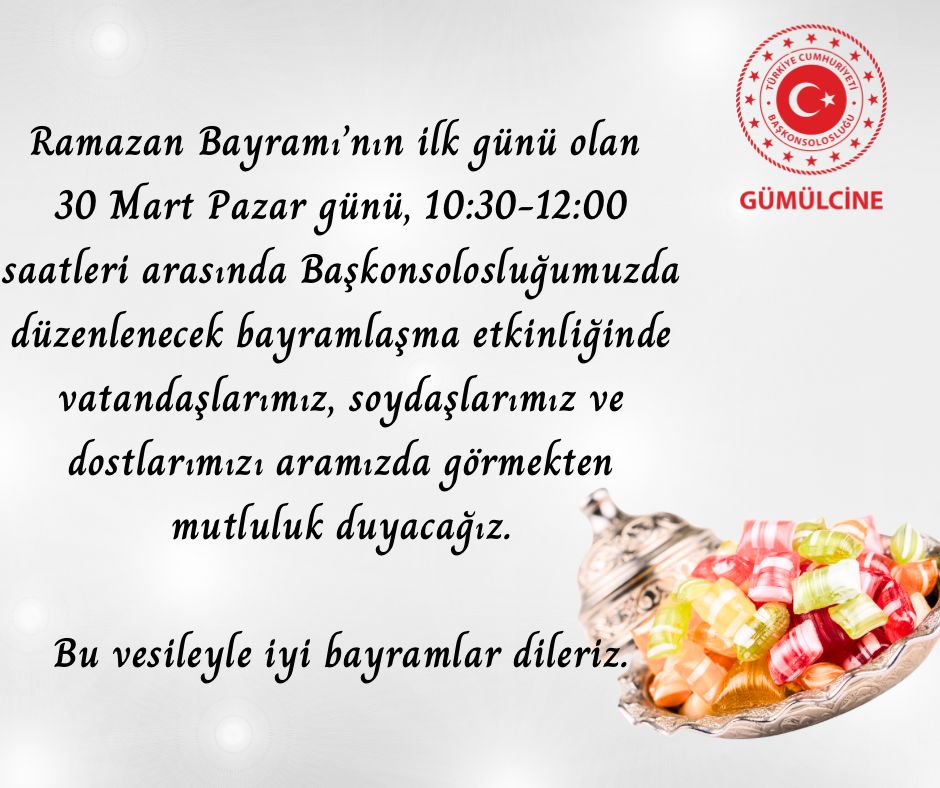 Türkiye’nin Gümülcine Başkonsolosluğu’nda geleneksel bayramlaşma töreni 30 Mart Pazar günü (bayramın birinci günü) yapılacak.