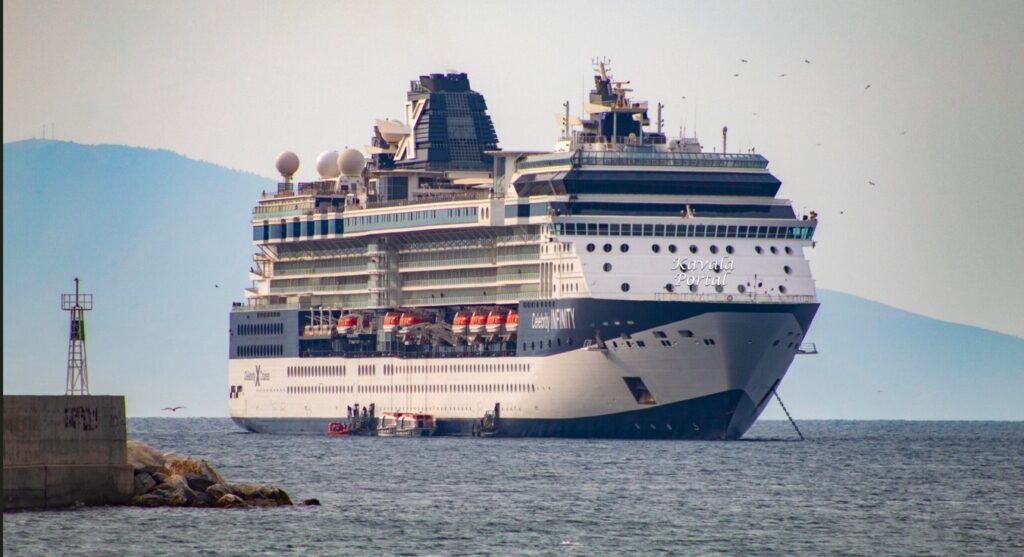 Sabahın erken saatlerinden itibaren, etkileyici devasa kruvaziyer gemisi Celebrity Infinity, limana yanaşması mümkün olmayınca Kavala limanının açıklarında demirledi.