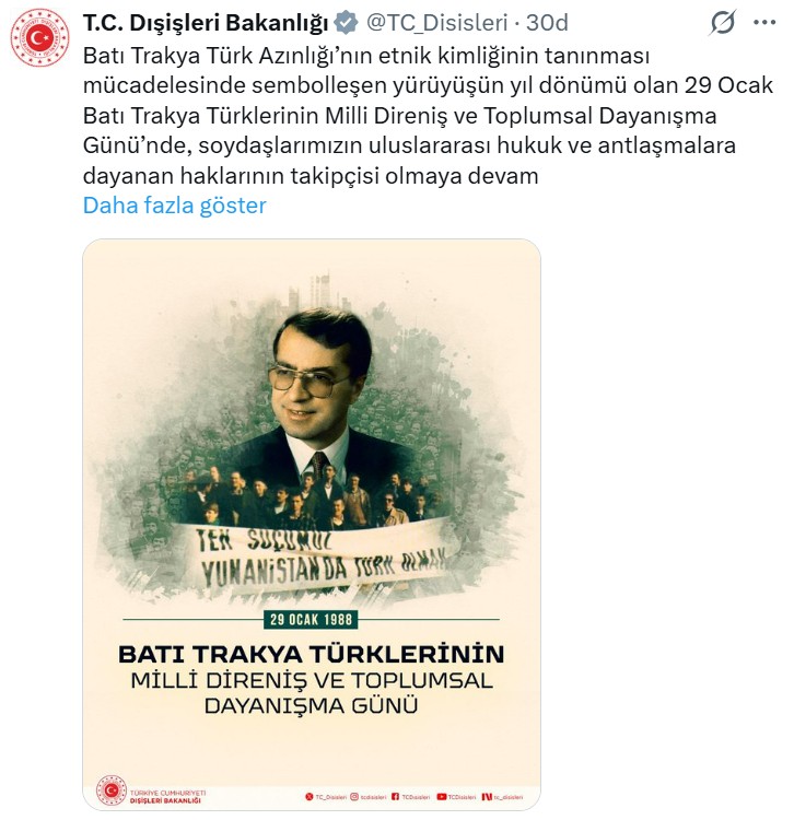 Paylaşımda yer alan görselde, Batı Trakya Türklerinin sembol ismi Dr. Sadık Ahmet ve “Tek suçumuz Yunanistan’da Türk olmak” yazılı pankartla yürüyen topluluğun fotoğrafları dikkat çekti. 29 Ocak 1988, bölgedeki Türk azınlığın kimlik mücadelesinde bir dönüm noktası olarak kabul ediliyor. O gün Gümülcine’de toplanan binlerce Türk, baskılara karşı tek bir ağızdan kimliklerini haykırmış ve bu direniş dünya kamuoyunda büyük yankı uyandırmıştı.