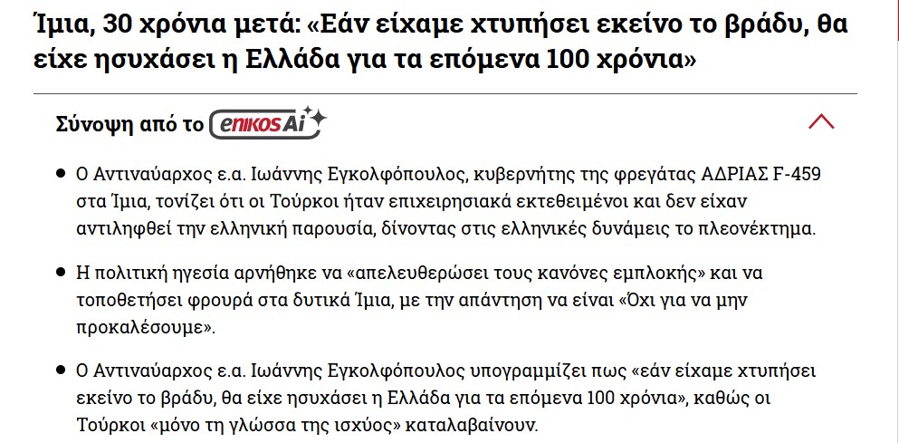 Dolayısıyla Yunanistan’da büyük yankı uyandıran ve Yunan gazeteci Hristos Mazanitis’in enikos.gr için yaptığı röportaj, 1996 Kardak (İmia) gecesine dair bugüne kadar kamuoyuna yansımamış operasyonel ayrıntıları yeniden gündeme taşıdı.