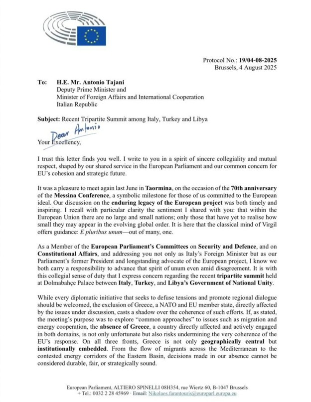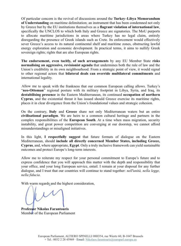 Farantouris’in Antonio Tajani’ye yazdığı mektup