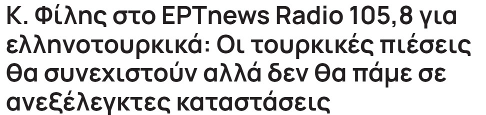Uluslararası İlişkiler Profesörü Kostas Filis, ERTnews Radio 105,8’de yayımlanan “Sabah Rotaları” programında Vasilis Adamopulos ve Maria Georgiu’nun sorularını yanıtlarken, Türkiye’nin Yunanistan ve Güney Kıbrıs’ın son dönemdeki hamlelerinden duyduğu rahatsızlığı değerlendirdi.