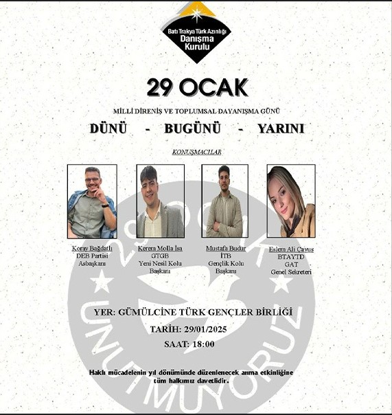 “29 Ocak Milli Direniş ve Toplumsal Dayanışma Günü – Dünü, bugünü, yarını” başlığı altında yapılacak etkinlik, 29 Ocak Çarşamba günü Gümülcine Türk Gençler Birliği lokalinde saat 18.00’de başlayacak. Etkinliğe tüm Batı Trakya halkının davetli olduğu belirtiliyor.