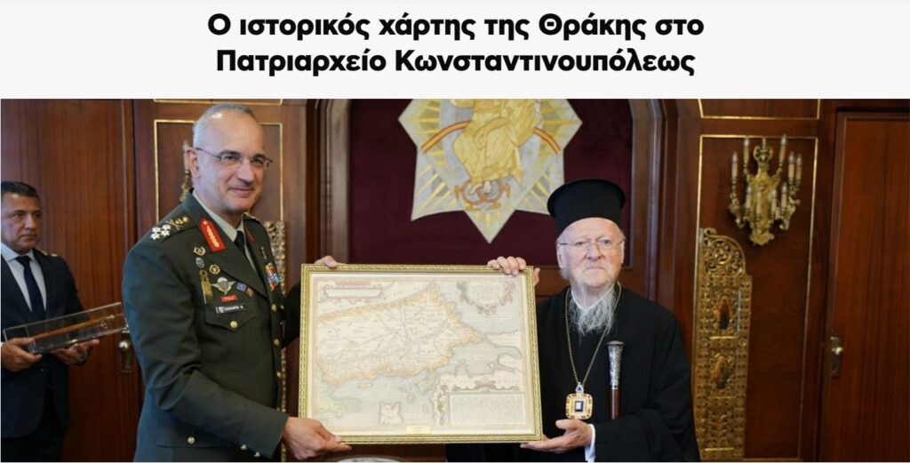 Ziyaret sırasında Yunanistan Genelkurmay Başkanı General Hupis Patrik Bartholomeos’a çerçeveli bir harita hediye etti ve ikili hep birlikte ellerinde bu haritayla verdiği poz dikkat çekti.