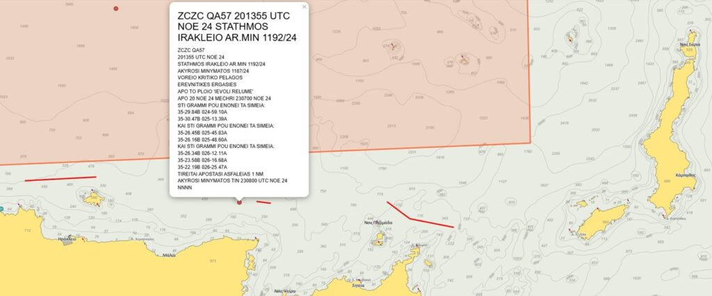 Yunan hidrografik servisi, 20-24 Kasım tarihleri arasında İtalyan araştırma ekibi tarafından yapılan araştırmalar için yeni bir NAVTEX yayınladı.