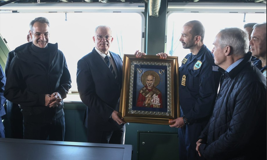 Fırkateyn komutanı Yarbay İoannis Kizanis, Cumhurbaşkanı’na geminin armasını takdim ederken; Tasoulas da buna karşılık komutana Aziz Nikolaos ikonu sundu.