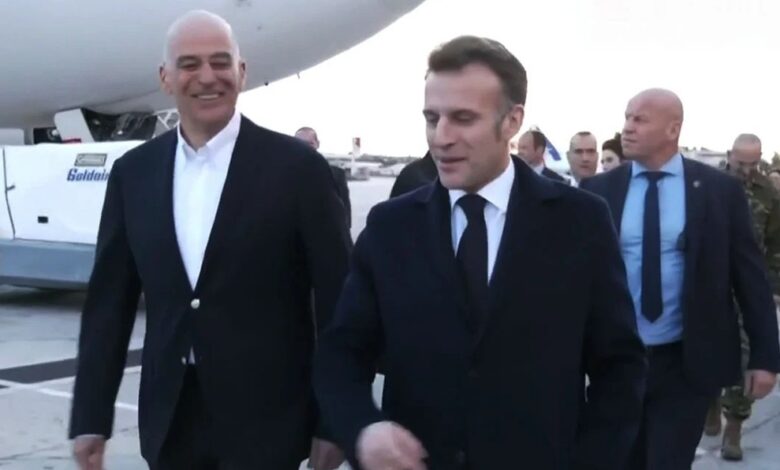 Yunanistan Savunma Bakanı Nikos Dendias tarafından karşılanan Macron, Charles de Gaulle uçak gemisine geçerek bölgedeki Fransız askeri varlığını denetleyecek.