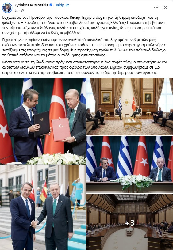 **“Türkiye Cumhurbaşkanı Recep Tayyip Erdoğan’a sıcak karşılaması ve misafirperverliği için teşekkür ediyorum. Yunanistan–Türkiye Yüksek Düzeyli İşbirliği Konseyi Toplantısı, özellikle akışkan ve sürekli değişen bir uluslararası ortamda, diyalogun ve iyi komşuluk ilişkilerinin taşıdığı değeri teyit etmektedir.