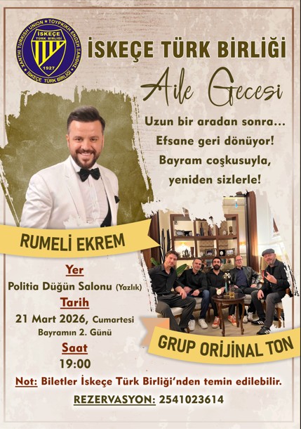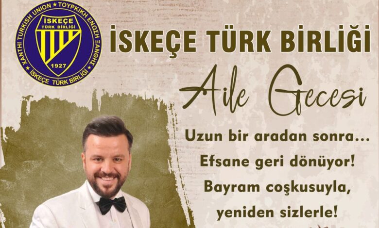Batı Trakya’nın yarım asırlık çınarı İskeçe Türk Birliği (İTB), uzun bir aranın ardından geleneksel “Aile Gecesi” etkinliğini muhteşem bir programla yeniden hayata geçiriyor. Ramazan Bayramı’nın ikinci akşamı düzenlenecek olan gece, İskeçe’de tam bir müzik şölenine dönüşecek.