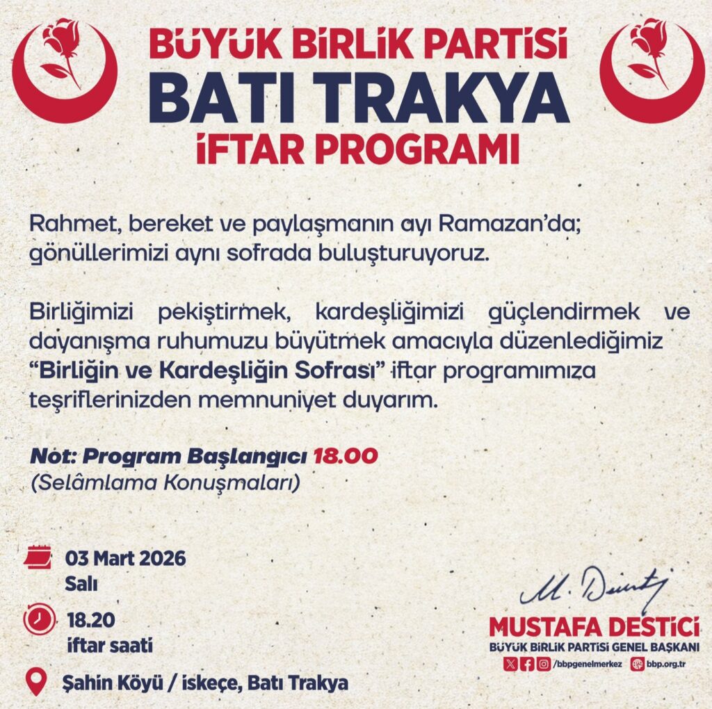 İftar programının 03 Mart 2026 Salı günü Şahin Köyünde gerçekleştirileceğini belirten Serin, programa Büyük Birlik Partisi Genel Başkanı Mustafa Destici’nin de katılacağını açıkladı. Serin, Türkiye ile Batı Trakya arasındaki tarihî ve stratejik kardeşliğe dikkat çekerek, bu buluşmanın iki toplum arasındaki dayanışmanın güçlü bir göstergesi olduğunu vurguladı.
