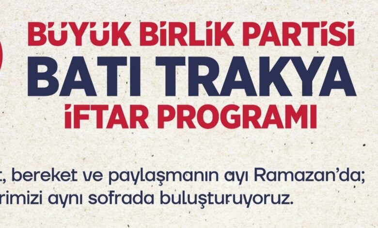 Büyük Birlik Partisi Dış İlişkiler ve Türk Dünyasından Sorumlu Genel Başkan Yardımcısı Prof. Dr. Emin Serin, Ramazan ayı vesilesiyle Batı Trakya’da düzenlenecek iftar programına ilişkin açıklamada bulundu. Serin, Ramazan’ın rahmetini ve bereketini Batı Trakya halkıyla paylaşacaklarını belirterek, bu buluşmanın gönül coğrafyamızla kurulan güçlü bağların bir nişanesi olduğunu ifade etti.