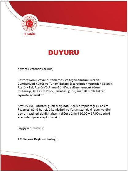Selanik Başkonsolosluğu tarafından yapılan duyuru ile Selanik Atatürk Evi’nin yeniden ziyarete açılması, özellikle 10 Kasım öncesinde gündemin en önemli konularından biri haline geldi. Türkiye ve Yunanistan’dan gelecek çok sayıda vatandaşın bu anlamlı günde evi ziyaret etmesi bekleniyor.