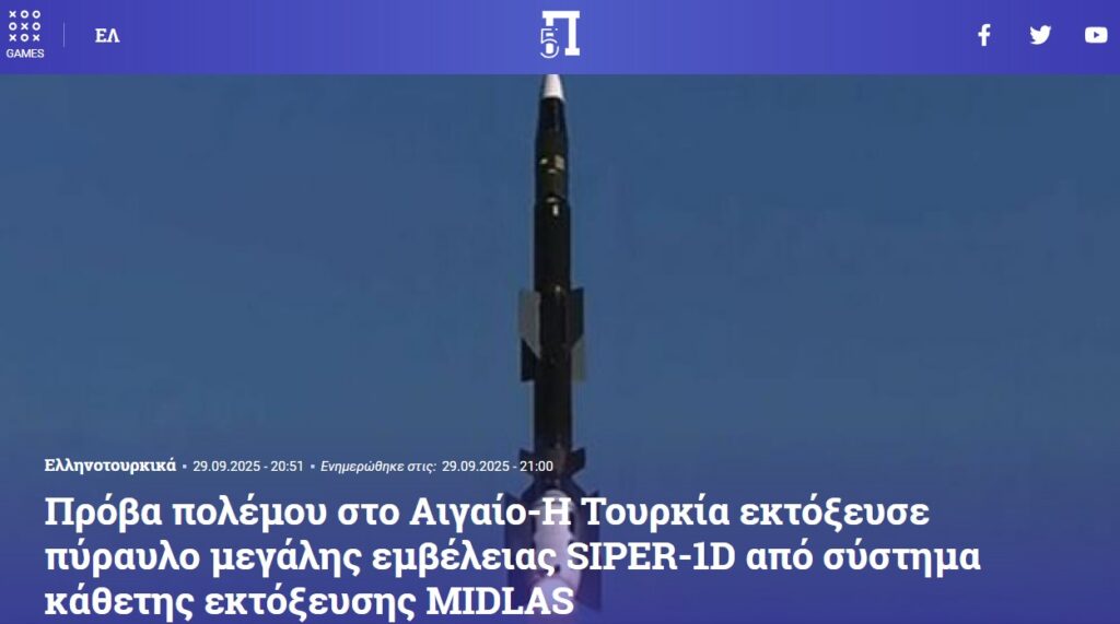 Yunan basını, “Ege’de savaş provası. Türkiye, uzun menzilli SIPER-1D füzesini MIDLAS dikey atım sisteminden fırlattı” başlığıyla duyurdu.