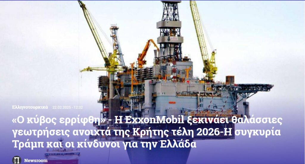 Uluslararası Medya, Amerikan enerji devi ExxonMobil’in, muhtemelen adanın (Girit) güneybatısında bulunan, sahip olduğu iki lisanstan daha olgun olanında, Girit açıklarında ilk sondaja yönelik yol haritasını 2025 ortalarında duyurmayı planladığını belirtiyor.