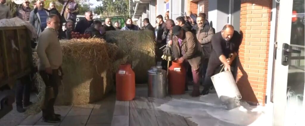 Kavala’da çiftçilerden Bölge Başkanlığı (Eski Valilik) binası önünde süt, saman ve üzümlü protesto!