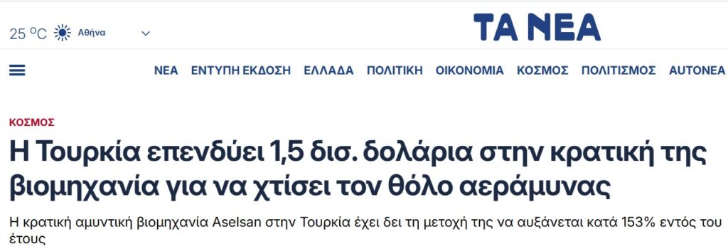 Ta Nea: “Türkiye, Hava Savunma Sistemi “Çelik Kubbe” İçin 1,5 Milyar Dolarlık Yatırım Yapıyor”