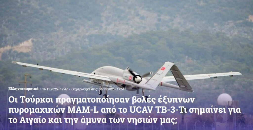 Bayraktar TB3, ROKETSAN’ın MAM-L IIR mühimmatı ile gerçekleştirdiği 3 atış Yunan basınında “Türkler TB-3 SİHA’dan MAM-L Akıllı Mühimmat Atışları Gerçekleştirdi: Ege ve Adalarımızın Savunması İçin Ne Anlama Geliyor?” başlığıyla duyuruldu.