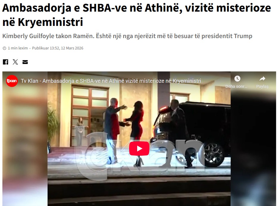 Arnavutluk medyasında yer alan bir habere göre, ABD’nin Atina Büyükelçisi Kimberly Guilfoyle, Tiran’a gayriresmî bir ziyaret gerçekleştirerek Arnavutluk Başbakanı Edi Rama ile görüştü.
