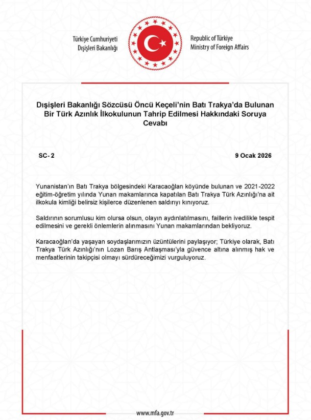 “Yunanistan’ın Batı Trakya bölgesindeki Karacaoğlan köyünde bulunan ve 2021-2022 eğitim-öğretim yılında Yunan makamlarınca kapatılan Batı Trakya Türk Azınlığı’na ait ilkokula kimliği belirsiz kişilerce düzenlenen saldırıyı kınıyoruz. Saldırının sorumlusu kim olursa olsun, olayın aydınlatılmasını, faillerin ivedilikle tespit edilmesini ve gerekli önlemlerin alınmasını Yunan makamlarından bekliyoruz.”