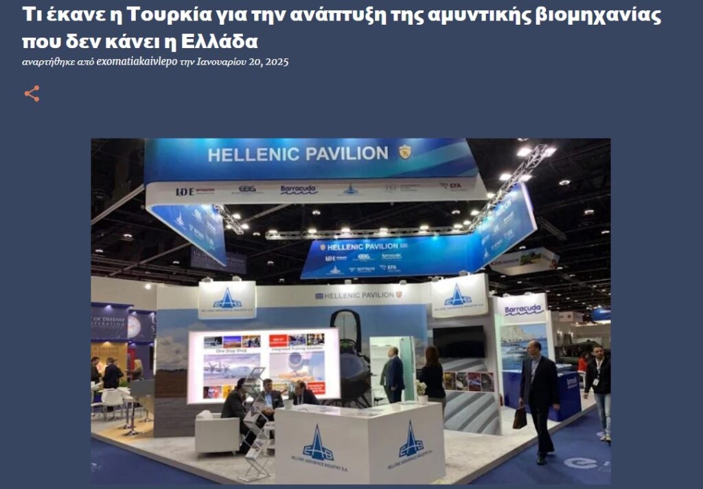 Yunanistan Hava Kuvvetleri’nden Emekli İkarus Havacılık Mühendisleri Okulu (SMA) Elektronik Bölümü mezunu Tuğgeneral ve Yunan Havacılık ve Uzay Sanayii’nin (EAB) eski Başkan Yardımcısı Haralambos Papaspiros tarafından exomatiakaivlepo.blogspot.com (gözlerim var ve görüyorum) haber sitesinde kaleme alınan “Türkiye savunma sanayisini kalkındırmak için Yunanistan’ın yapmadığı neyi yaptı?” başlıklı makalede, Türkiye Savunma sanayisine başarılarıyla değinirken Yunanistan yapamadıklarıyla eleştiriliyor.