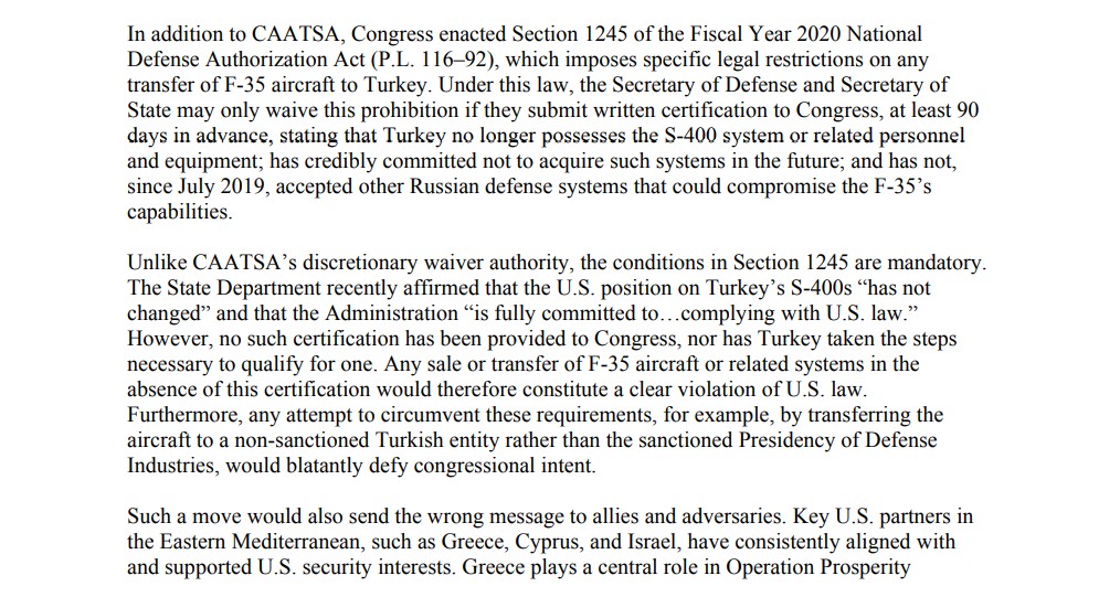 Herhangi bir satış yapılmadan önce yönetimin Kongre’ye sunması gereken sertifikasyon gerekliliklerini vurgulayan üyeler şunları yazdı: “CAATSA’ya ek olarak, Kongre, Mali Yılı 2020 Ulusal Savunma Yetkilendirme Yasası’nın 1245. Maddesini yürürlüğe koydu… bu madde, F-35 uçaklarının Türkiye’ye herhangi bir transferine ilişkin belirli yasal kısıtlamalar getirmektedir… Ancak, Kongre’ye böyle bir sertifikasyon sağlanmamıştır, ne de Türkiye böyle bir sertifikasyon elde etme koşullarını yerine getirmek için gerekli adımları atmıştır. Bu sertifikasyon olmaksızın F-35 uçaklarının veya ilgili sistemlerin herhangi bir satışı veya transferi, Amerikan yasalarının açık bir ihlali olacaktır. Ayrıca, bu gereklilikleri atlatmaya yönelik herhangi bir girişim… Kongre’nin niyetine açıkça meydan okuyacaktır.”