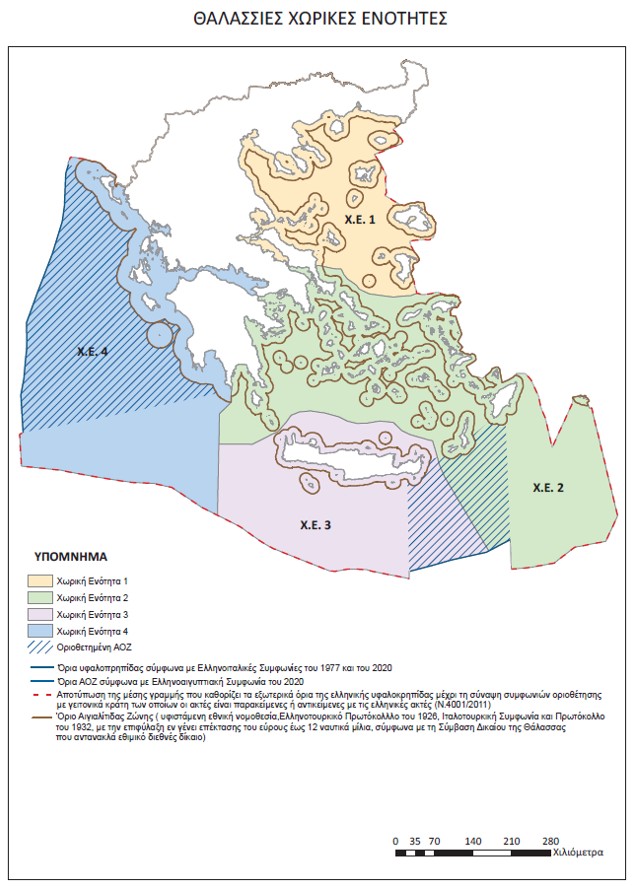 Haritada gösterilen deniz bölgeleri, 1977 ve 2020 tarihli Yunanistan-İtalya MEB sınırlandırma anlaşmaları ile 2020 tarihli Yunanistan-Mısır anlaşmasını içermekte ve 4001/2011 sayılı yasadan kaynaklanan sınırlarla örtüşmektedir.
