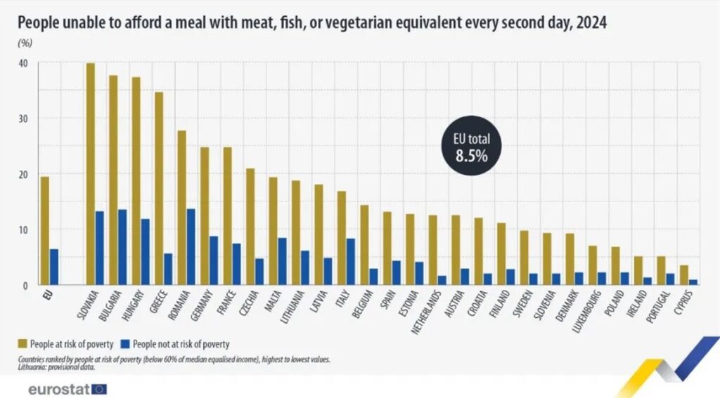 2024 verileri, AB nüfusunun %8,5’inin her iki günde bir et, balık veya eşdeğer bir vejetaryen öğünü karşılayamadığını gösteriyor. Bu oran, 2023’e göre 1 puanlık bir düşüşle %9,5’ten azaldı.