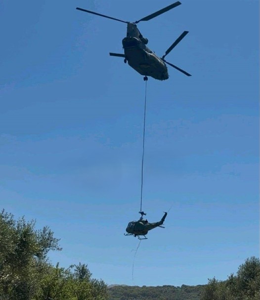 Hazırlıkların tamamlanmasının ardından bölgeye gelen Chinook, Agusta Bell’i gövdesinden halatlarla bağlayarak havaya kaldırdı ve güvenli bir şekilde Kastelli Hava Üssü’ne nakletti.